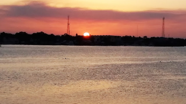 Waiting for the sun to set, we occupied ourselves with the area, a bit of wildlife, and Jim noticed big swirls in the river. Turned out to be a group of dolphins - 6 or 8 playing quite close. I only had my phone camera, so did not get any good photos of the dolphins,